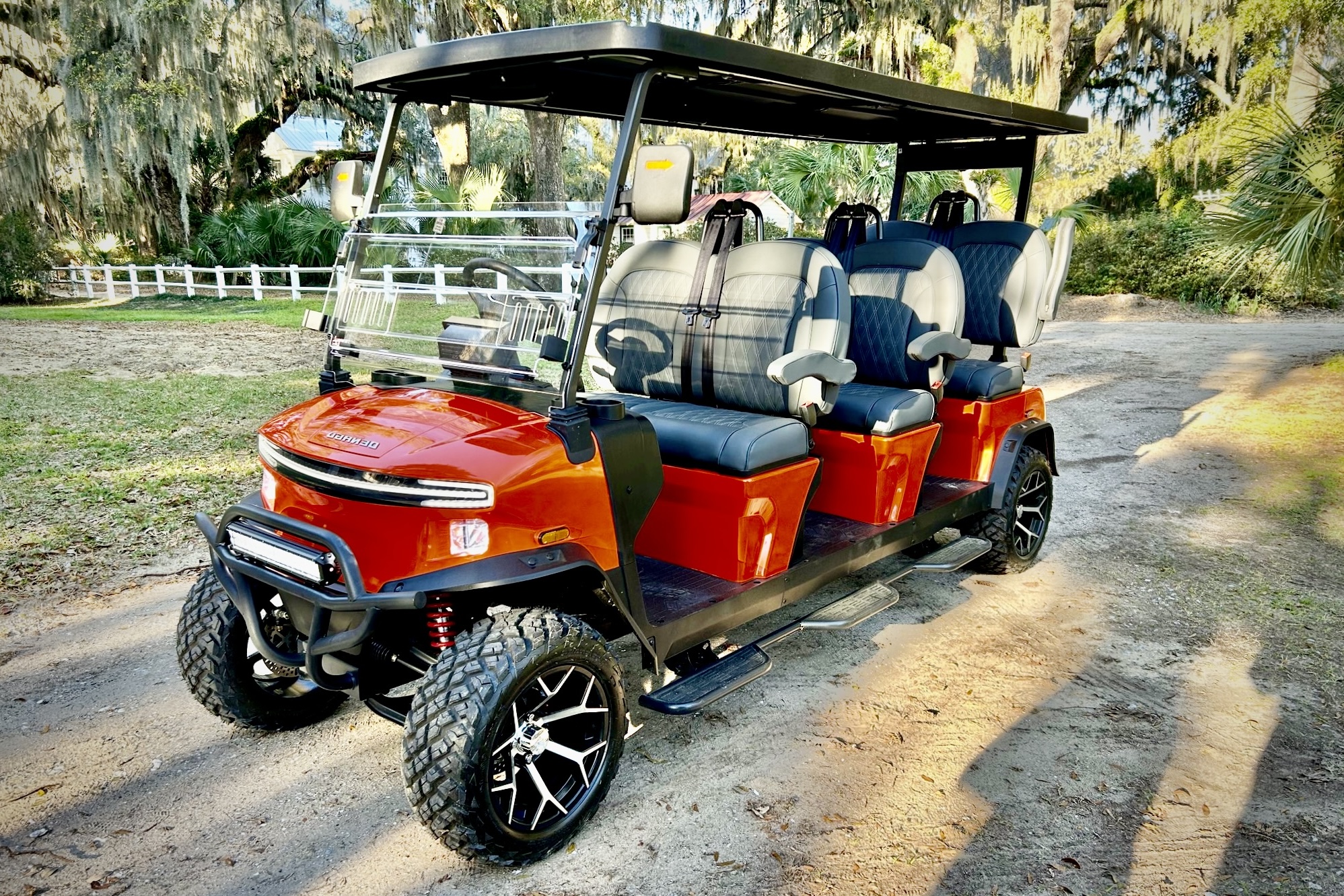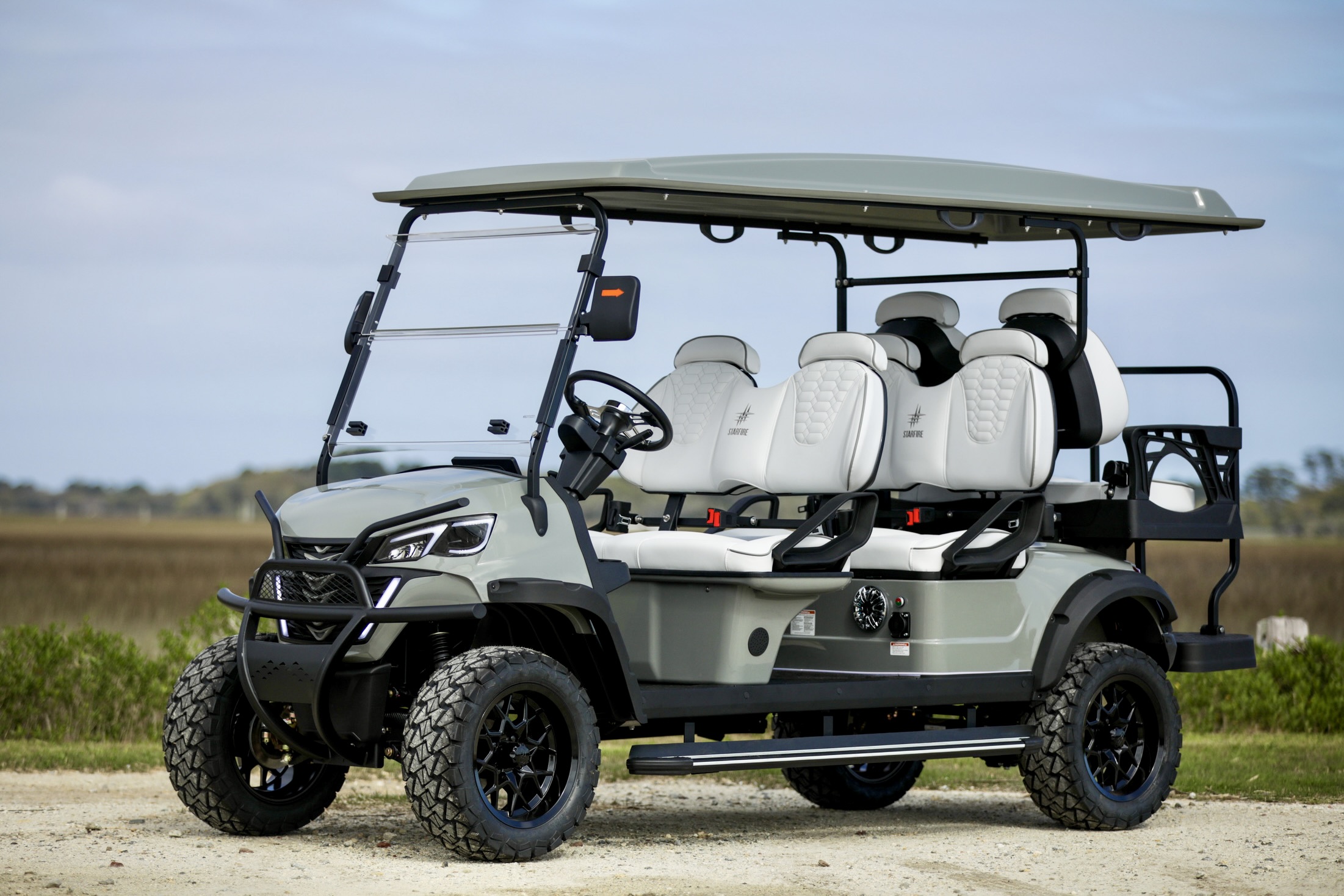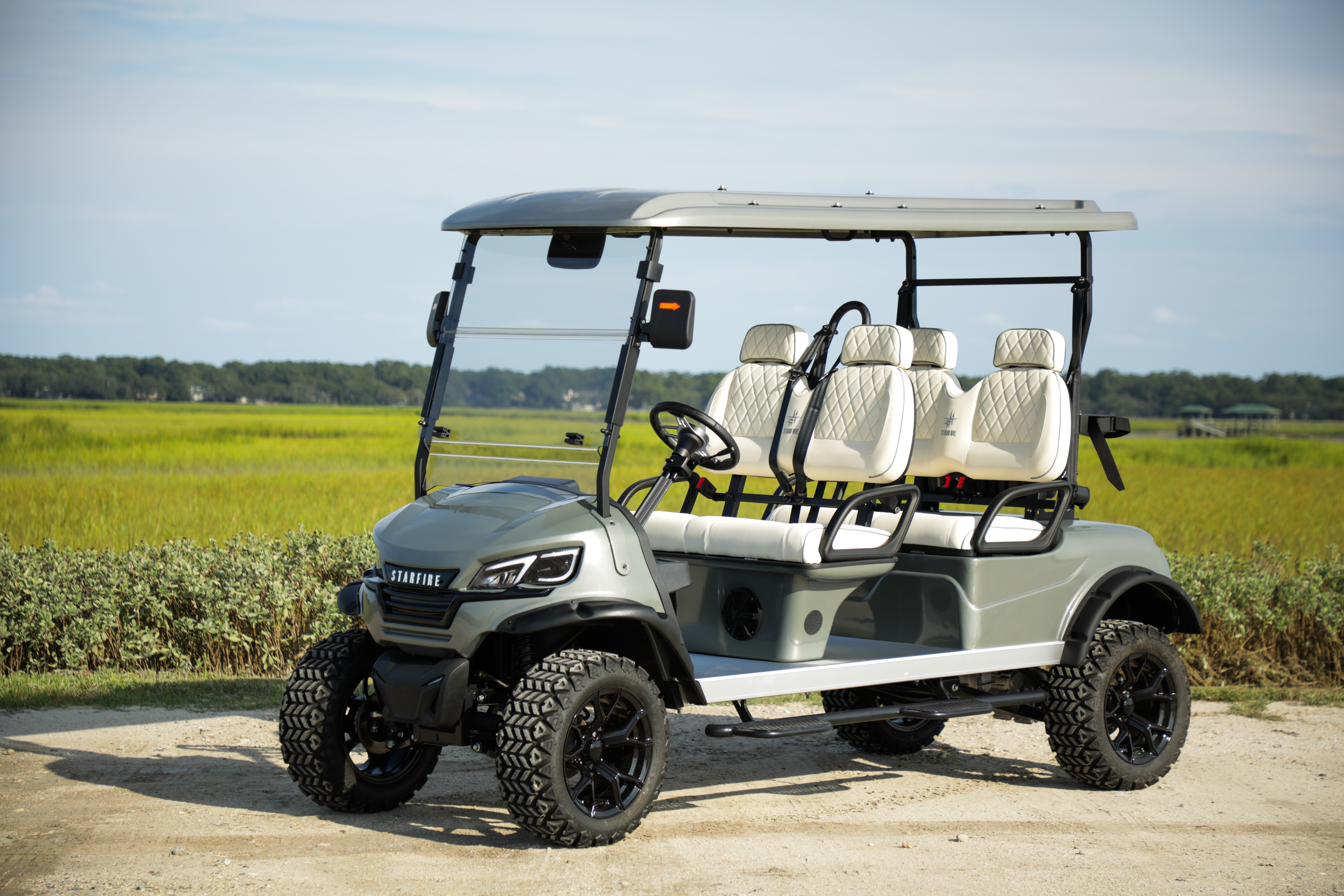 You won’t find a nicer ride on the island than a Starfire Luxury Low Speed Vehicle. Our LSVs are lifted, street legal, and equipped with lithium batteries, captain’s chair seats, Bluetooth, Apple CarPlay, Android Auto, App controlled accent lighting, subwoofers, backup cameras, and everything you need to transport your family and friends safely around Folly Beach. Our fleet is made right here in Charleston, South Carolina and we stand behind our commitment to quality construction and unmatched customer service. We offer 4 and 6 seat Low speed vehicles including forward facing Limo style carts for special events. Let us help you make the most of your visit to Folly Beach with a smooth and stylish ride. Reserve your LSV online or give us a call!